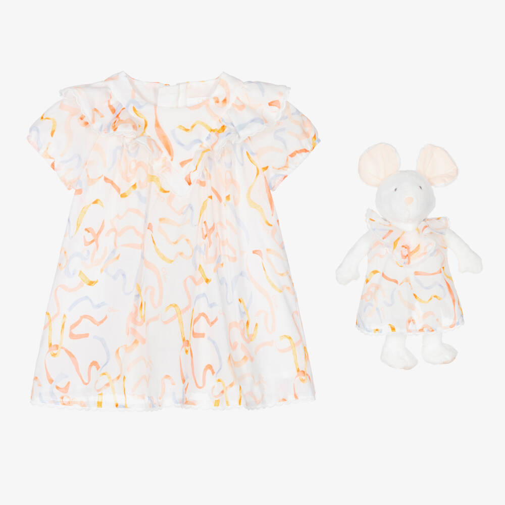 Adorable ivory dress and soft toy gift set for baby girls by luxury French designer, Chloé. Made in soft and lightweight cotton voile and fully lined for comfort, the dress has a pretty ribbon and logo print in pink, blue and yellow. It has a ruffle detail on the front and back, sweet puffed sleeves with elasticated cuffs, and the designer's signature scalloped trim. It comes with a cute plush mouse toy, with sweet embroidered features and wearing a matching dress. The mouse has a branded label on the back and an embroidered logo on one foot, and the dress has an embroidered logo on the back together with '2023' to mark the year of baby's birth.