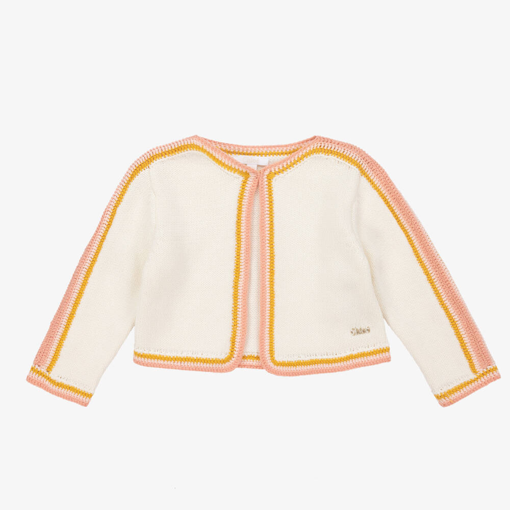 Sweet ivory cardigan for babye girls, by luxury French designer Chloé. Beautifully knitted in soft organic cotton, it has delicate mustard yellow and pink macramé trims and a tonal logo embroidered near the hem. It fastens with a hook and eye on the front for a cute, boho-inspired look.