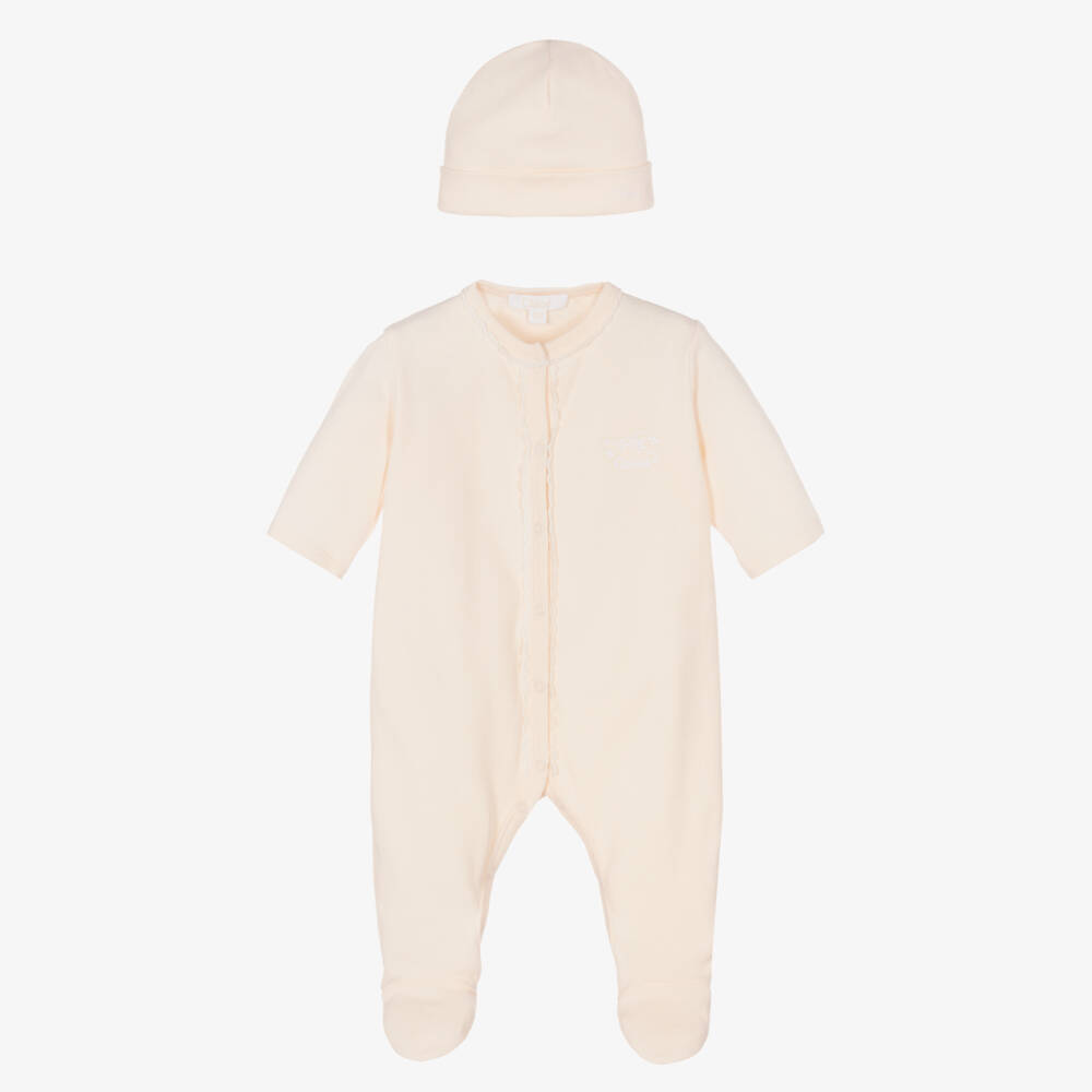 Lovely pale pink babygrow set for girls, by luxury French designer Chloé. Knitted in soft organic cotton jersey, the cute babygrow has ivory scalloped detailing, with a delicate ivory logo embroidered on the chest. This sweet one-piece subtly fastens with poppers on the front and between the legs for easy dressing. It pairs with the matching layette hat, finely embroidered with the brand's logo. Ideal for gifting, it comes beautifully packaged in a branded box.