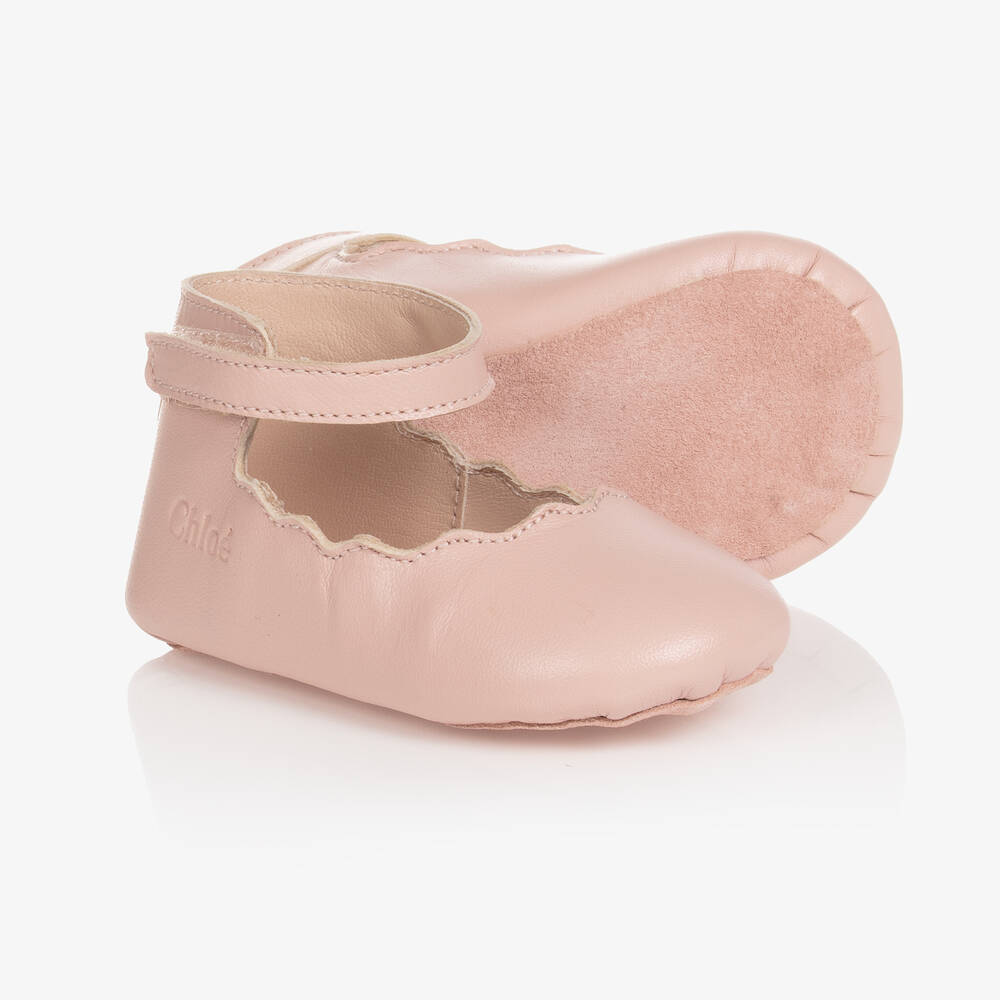 Sweet pink scallop pre-walker shoes for baby girls, by luxury French designer Chloé. Crafted in beautifully soft, supple leather, they have a soft leather insole and lining to keep babies little feet comfortable. They fasten with an easy-to-use velcro strap around the ankle, and have the brand's signature logo embossed on the sides for a luxurious finishing touch.