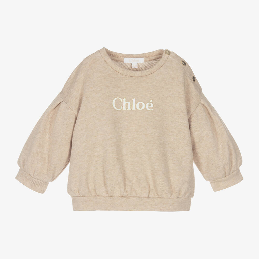 Lovely beige sweatshirt for little girls, designed by French brand Chloé. Made in soft organic cotton jersey, it has the signature logo print on the front with gold foil accents. The dropped sleeves have a puffed-look for a cute, relaxed feel. It fastens with shiny gold poppers on one shoulder, embossed with the brand's logo for a luxurious finishing touch.