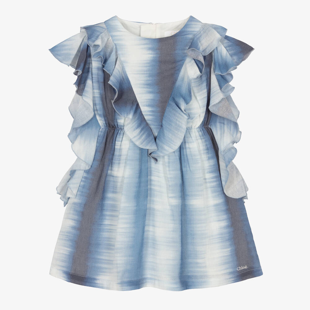 A cotton Mini-me dress for girls by luxury label Chloé, in a lovely gradient of blue and white tones. Accented with romantic ruffles, the soft, lightweight fabric drapes beautifully, with a gently elasticated waist for a feminine silhouette. The French designer's white logo is embroidered just above the hem for a subtle branded touch. It has a cotton lining for comfort and a concealed zip fastening on the back.