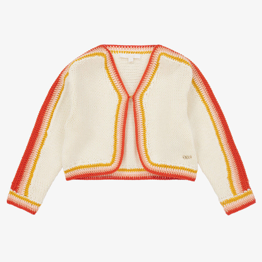 A gorgeous ivory cardigan for girls by luxury French brand Chloé, in a cosy, organic cotton knit. Fastening with a hook and eye fastening on the front, this long-sleeved piece has striped crochet trims in shades of orange, pink and mustard yellow. There is a gold-tone logo charm on one side for a discreet designer finish.