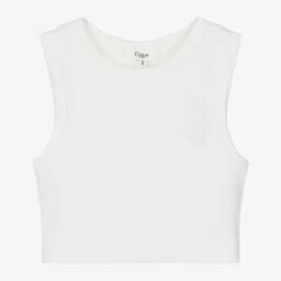 Ivory sleeveless top for girls by luxury label Chloé, with a tropical palm tree design on the front, incorporating the French designer's signature logo. Lovely for warm, summer days, this simple style is made from soft and comfortable cotton jersey.