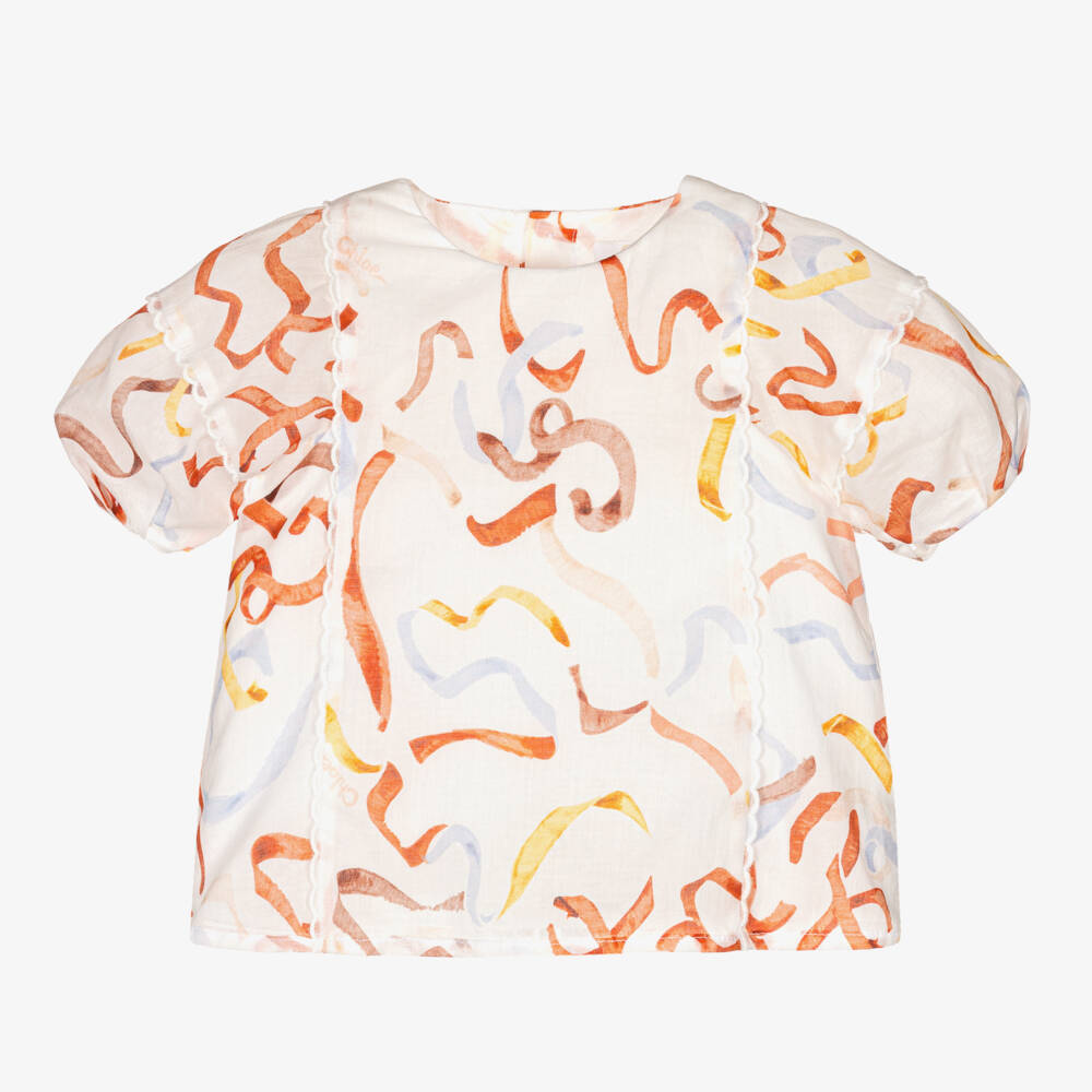 Beautiful ivory blouse for little girls from luxury French brand Chloé, with a ribbon logo pattern in pink, yellow and blue. Soft and lightweight, it is made and lined in cotton voile and has pretty puffed sleeves and signature scalloped trim. There are branded button fastenings on the back.
