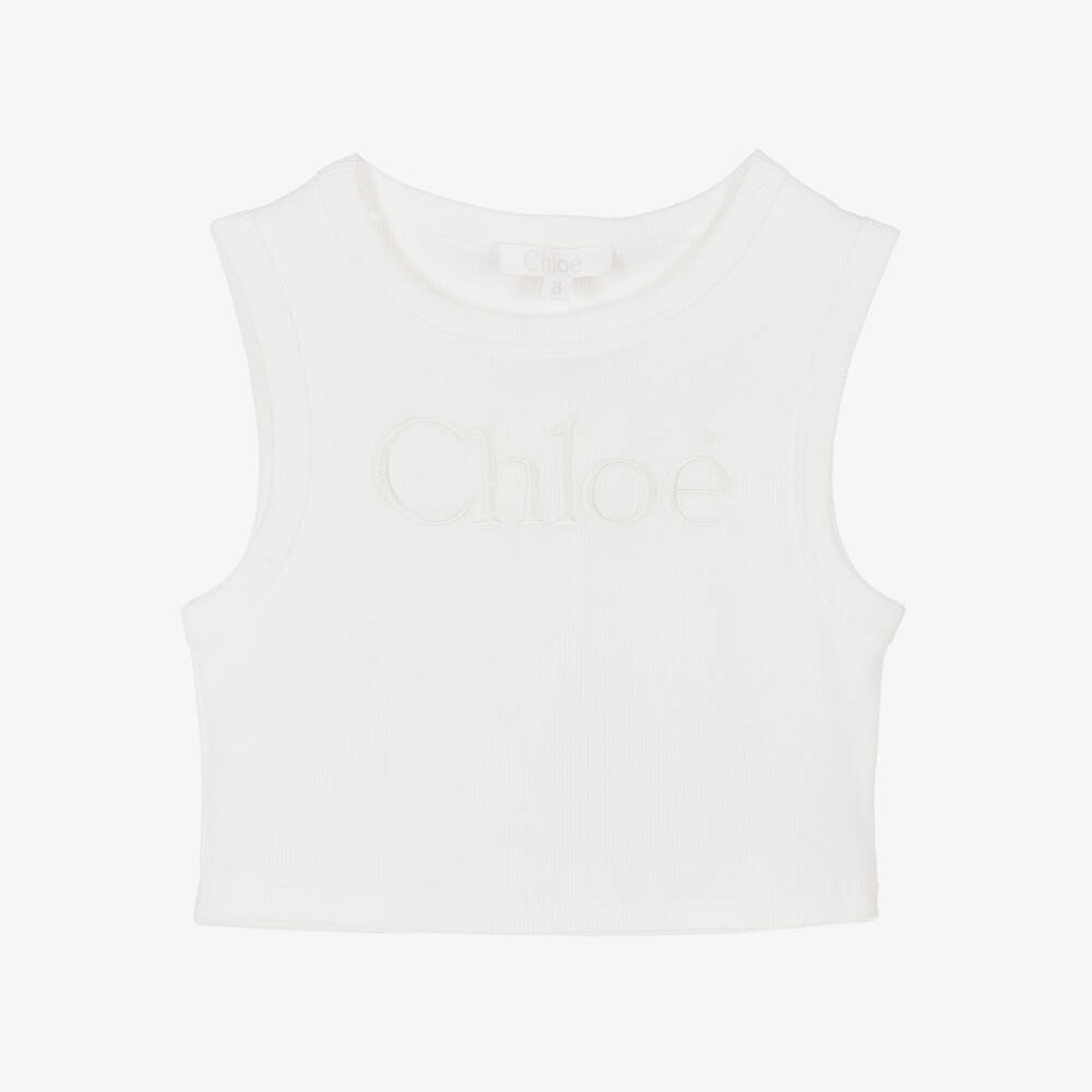 Short vest top in pale ivory for girls by luxury brand Chloé. This gently ribbed top is made in soft and stretchy organic cotton jersey, with tonal Chloé embroidery on the front for a subtle yet distinctive designer look.