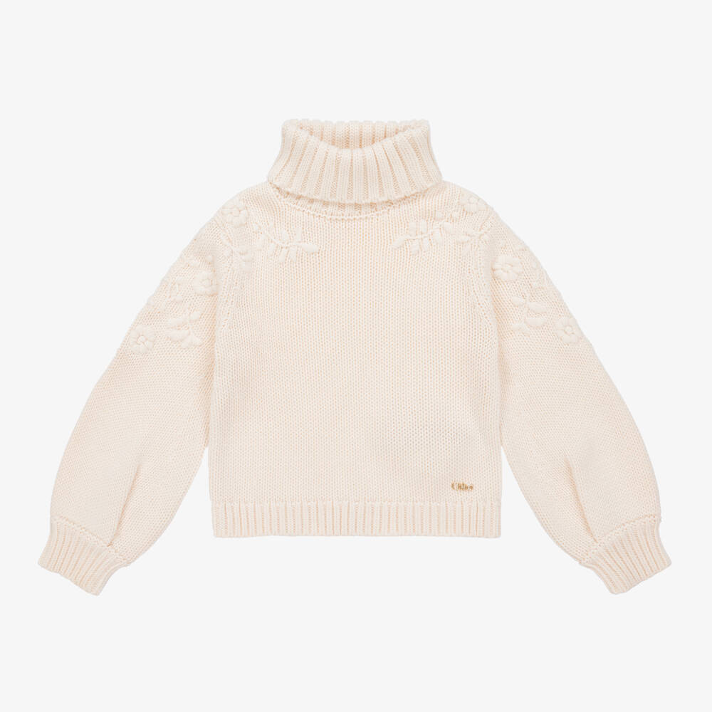 Inspired by the main collection, an ivory chunky knit jumper for girls by luxury French brand Chloé, with a ribbed roll neck. Made in a cosy organic cotton and wool blend, it is slightly cropped to sit on the waist and has full, bell-shaped sleeves. It is beautifully finished with tonal floral embroidery across the shoulders and sleeves, and has a gold-tone metal logo plate above the front hem.