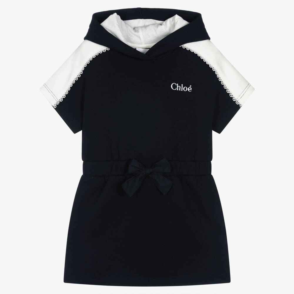 Casual navy blue hoodie dress for girls by French brand Chloé, made in mid-weight organic cotton sweatshirt jersey. Ivory shoulder panels with gorgeous guipure lace edges add a touch of feminine elegance to this relaxed design. The luxury designer's logo is embroidered on the front in ivory, and there are useful, concealed pockets on the sides. The waist is gently elasticated for comfort and detailed with a decorative bow on the front.