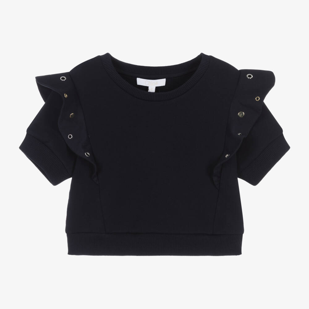Inspired by the adult collection, this navy blue sweatshirt for girls is by luxury French brand Chloé. Made in soft organic cotton jersey, it has ribbed trims, short sleeves and is designed to sit on the waist. Ruffles trim the shoulders for a feminine touch, with eye-catching gold eyelets to decorate. A small, tonal logo embroidery on the back signs off the look with a discreet designer detail.
