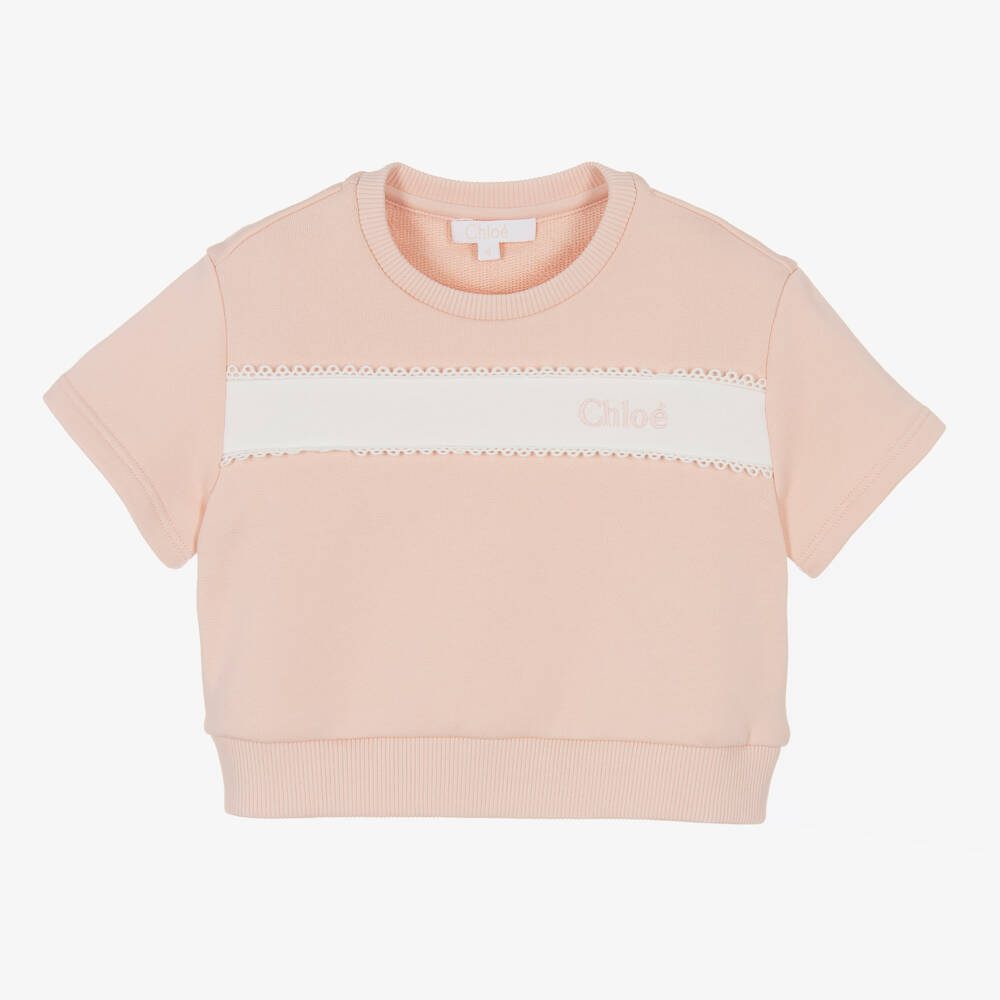 Pale pink organic cotton sweatshirt for girls by luxury French designer Chloé. Unmistakably by the brand, it has the signature logo embroidered on the front white panel in pink, with pretty guipure lace trims. Made in comfortable jersey, it has a ribbed hem for a neat fit.