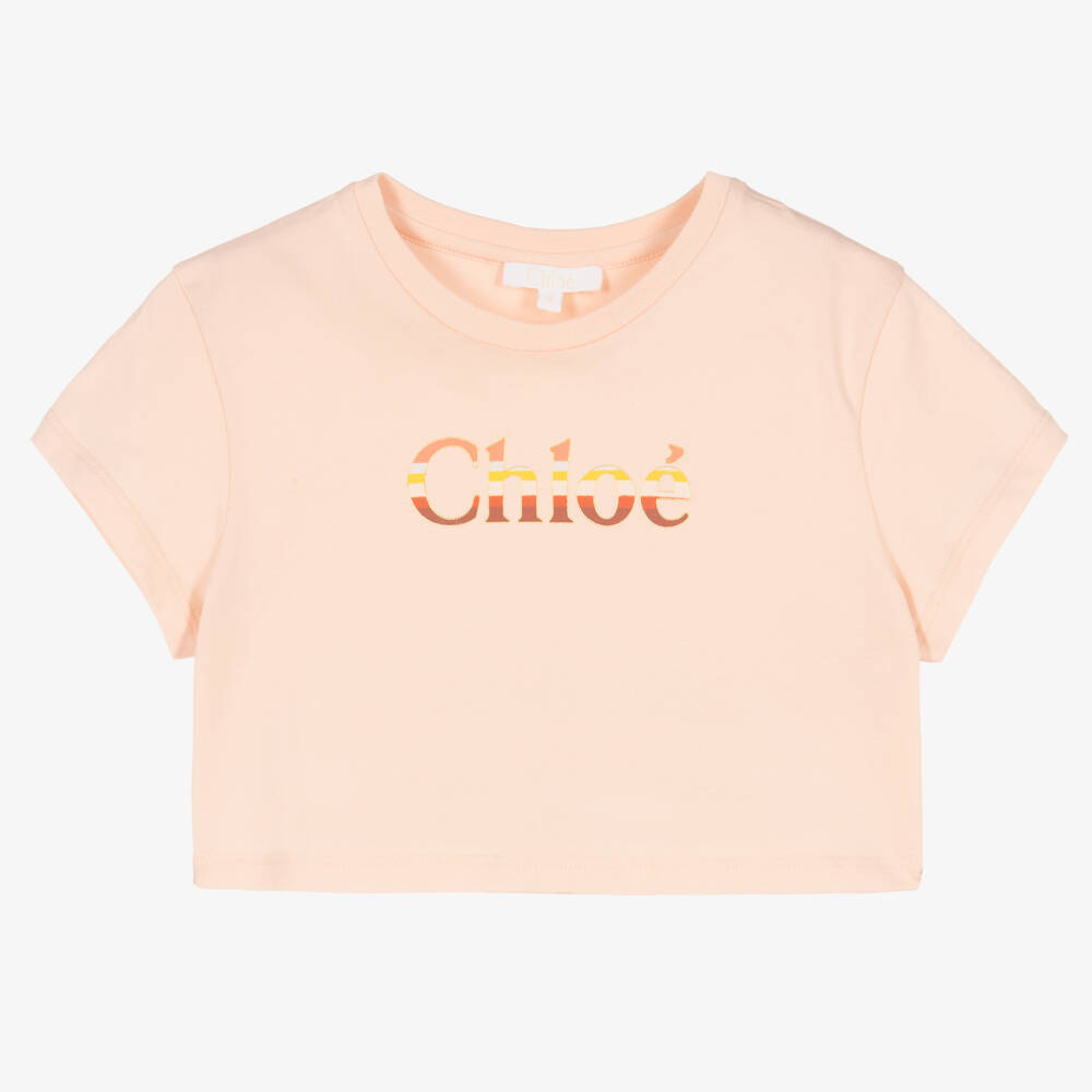 Pink cropped organic cotton T-shirt for girls by luxury designer Chloé. This boxy-fit top is made in soft, stretchy, comfortable jersey, with the French label's signature logo print in a colourful gradient design.