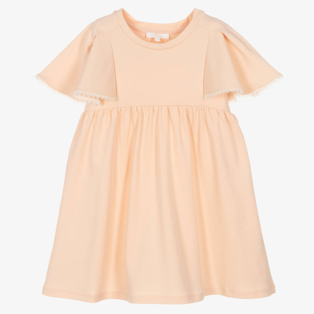 Pale pink dress for girls by French brand Chloé, made in super soft organic cotton jersey. For a sweet, romantic look, the sleeves are beautifully ruffled with delicate ivory guipure lace trims. High waisted, it has a little logo embroidered in ivory on the chest for subtle brand recognition.