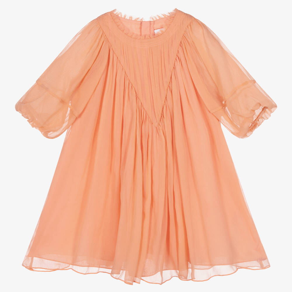 Mini-me coral pink dress for girls by French designer Chloé, made in luxurious, textured silk chiffon. With a gathered V-shaped bodice, it has a raw-edged, stand-up frill around the neckline and a concealed zip fastening on the back. The full, mid-length sleeves are gently elasticated at the cuffs for added volume. Fully lined in soft cotton voile, this beautiful dress has the designer's name above the hem in tonal embroidery for a discreet designer finish.
