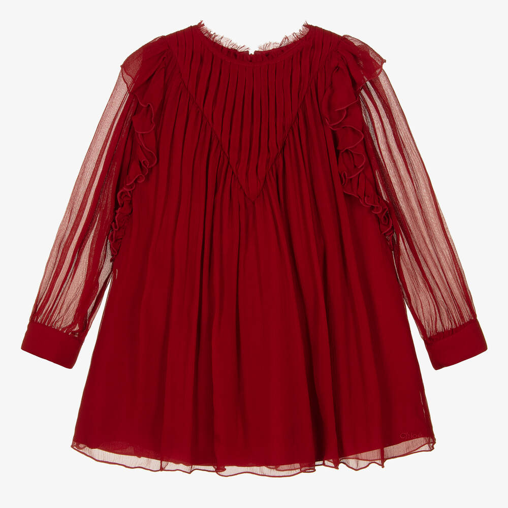 Beautiful burgundy red dress for girls by luxury French designer Chloé, made in lightweight, textured silk chiffon. With a box-pleated, V-shaped bodice, it has a raw-edged, stand-up frill around the neckline and gorgeous pleated ruffles around the full sleeves and over the shoulders. The label's signature logo is subtly embroidered above the hemline and there is a discreet, concealed zip fastening on the back. The dress is fully lined in soft twill for comfort.