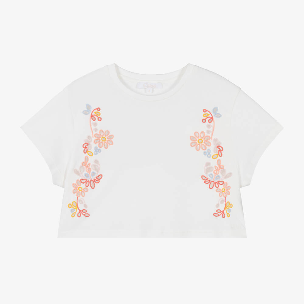 White T-shirt for girls by luxury French designer Chloé, made in stretchy, organic cotton jersey. Great for casual wear, this short-sleeved T-shirt has beautifully embroidered floral cut work on the front in shades of orange, pink, yellow and blue. The brand's logo can be seen above the hem in tonal embroidery.