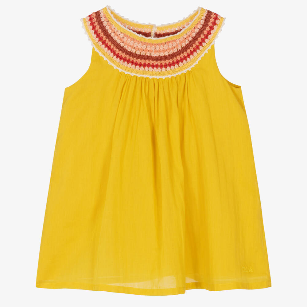 Gorgeous mustard yellow sleeveless dress for little girls, designed by French luxury brand Chloé. Woven in beautifully soft cotton, it has a relaxed floaty shape and a tonal logo delicately embroidered near the hem. The bohemian-inspired collar has charming dark pink and mustard yellow macramé trims. With attention to all the small details, the back button fastenings are embossed with the brand's logo for a discreet branded finish.