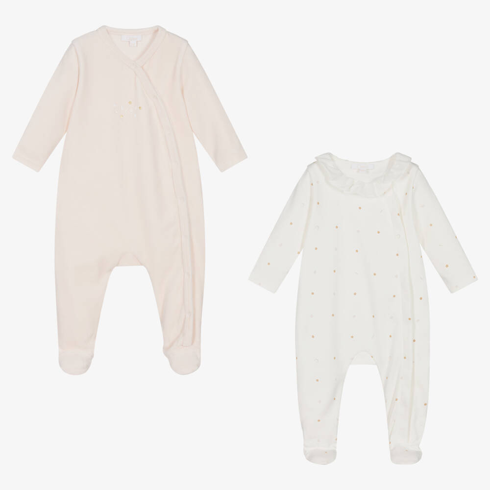 A lovely babysuit gift set for girls by luxury brand Chloé, in soft shades of ivory and pink. Made from organic cotton jersey, the ivory babygrow is patterned with the brand's signature flower and scattered logo lettering. It has a cute ruffled collar which adds a traditional touch. Gentle next to the skin, the pink velour babygrow has a V-neck and a logo print on the front for an understated finish. Both items have enclosed feet and useful popper fastenings to help with dressing.