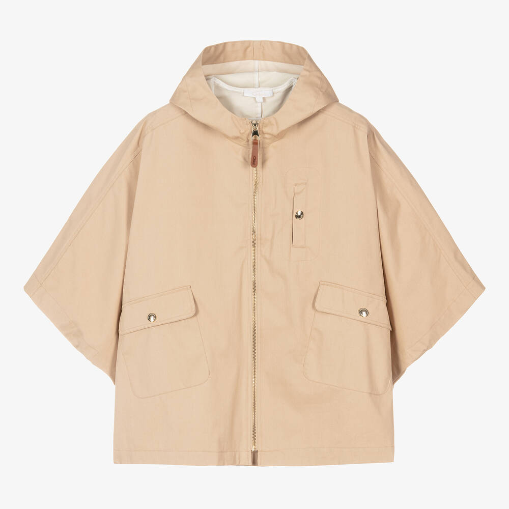 Inspired by the adult collection, this light beige cape for teen girls is designed by luxury brand Chloé. Ideal for layering, it is simply styled with a practical hood, gold-tone hardware and a leather logo zip pull on the front. All three pockets fasten securely with branded poppers, providing space for small, everyday essentials. Made in coated cotton-blend twill, it has an inverted, popper-fastening pleat on the back, giving extra space if needed.