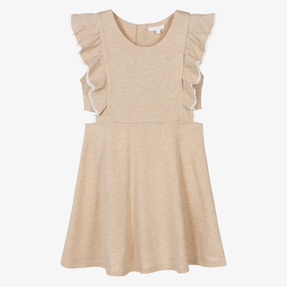 Beautiful and casual, a beige skater dress for teen girls by French brand Chloé. The bodice has pretty ruffles with elegant ivory guipure lace trims and cut-outs on the sides. Super soft and comfortable, it is made in organic cotton sweatshirt jersey with a lined bodice for extra comfort. There is an ivory Chloé logo embroidered by the front hem and a concealed zip fastening on the back for a neat finish.
