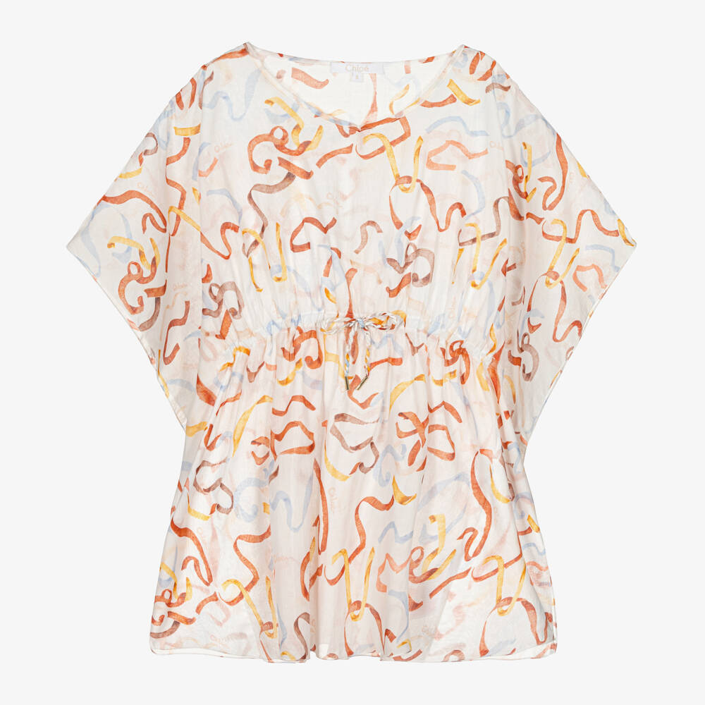 Lovely ivory organic cotton Mini-me beach kaftan for teen girls by luxury French designer Chloé, made in sheer voile for cool style on the sand or poolside. It has a colourful ribbon and subtle logo print, with an elasticated waist. It has a faux drawstring with shiny gold logo end caps.