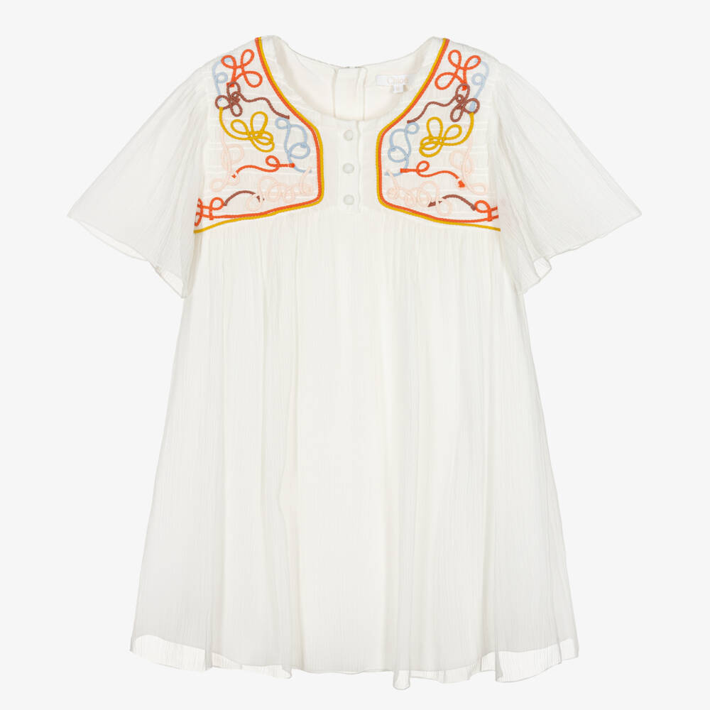 As seen in the main collection, a beautiful special occasion ivory chiffon dress for teen girls by luxury French designer Chloé, with a feminine, floaty feel. Made in luxurious, textured silk, it has colourful ribbon-effect appliqués on the front and back of the shirred bodice, with gathers below. The sheer sleeves are gently gathered and the dress fastens with buttons on the front and a neat, concealed zip around the back. It is fully lined for comfort and has a tonal logo embroidered by the hem for a discreet branded touch.