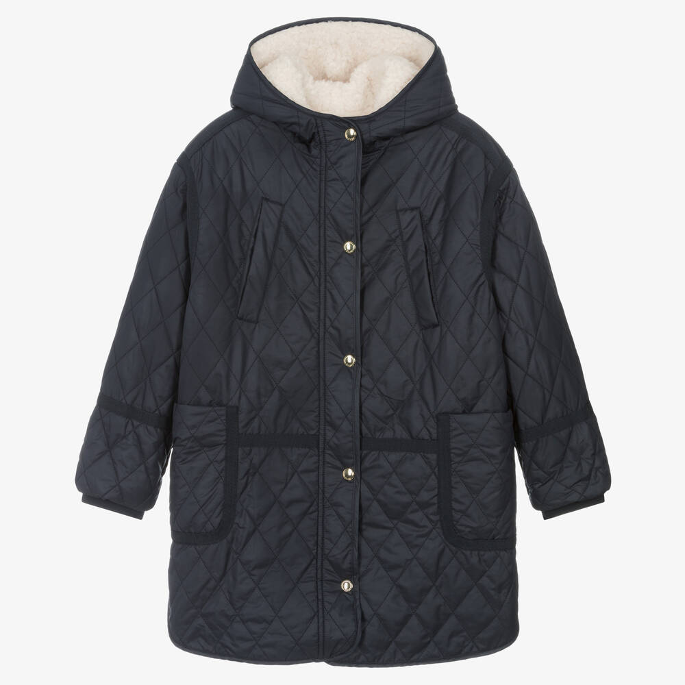 From luxury French fashion house Chloé, a quilted and hooded navy blue coat for teen girls. It has a stylish diamond stitch pattern and woven web detailing, with branded gold-tone popper fastenings on the front. This cosy style is lined in ivory sherpa fleece, with lightweight, breathable insulation, and ribbed cuffs. It has a contemporary, shaped hem, four front pockets and fastens with a zip beneath the front popper flap.