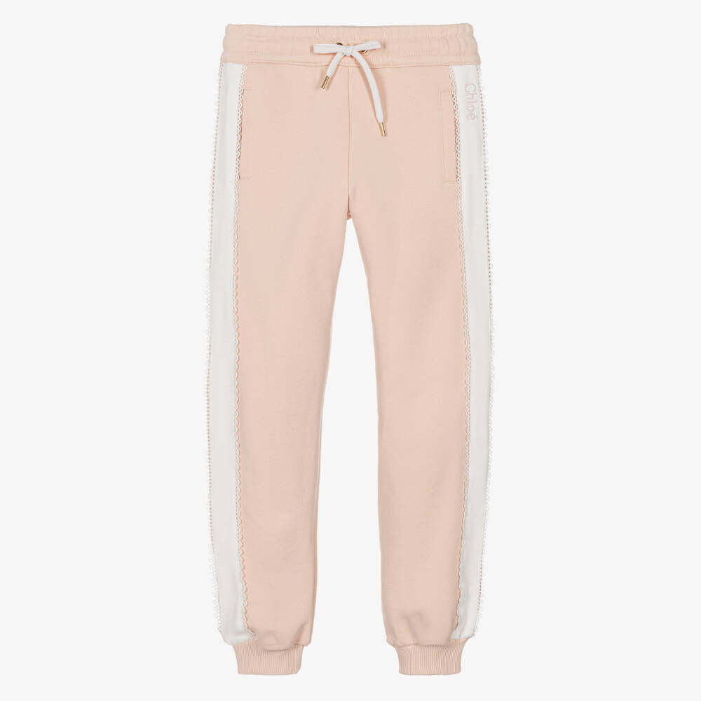 Pale pink organic cotton joggers for teen girls by luxury French designer Chloé, ideal for relaxed days. Unmistakably by the brand, they have the signature logo embroidered on one side in pink. Made in comfortable jersey, they have jetted front pockets and white side panels with embroidered guipure lace trims. The elasticated waistband has a drawstring for a good fit, with shiny gold logo eyelets and end caps.