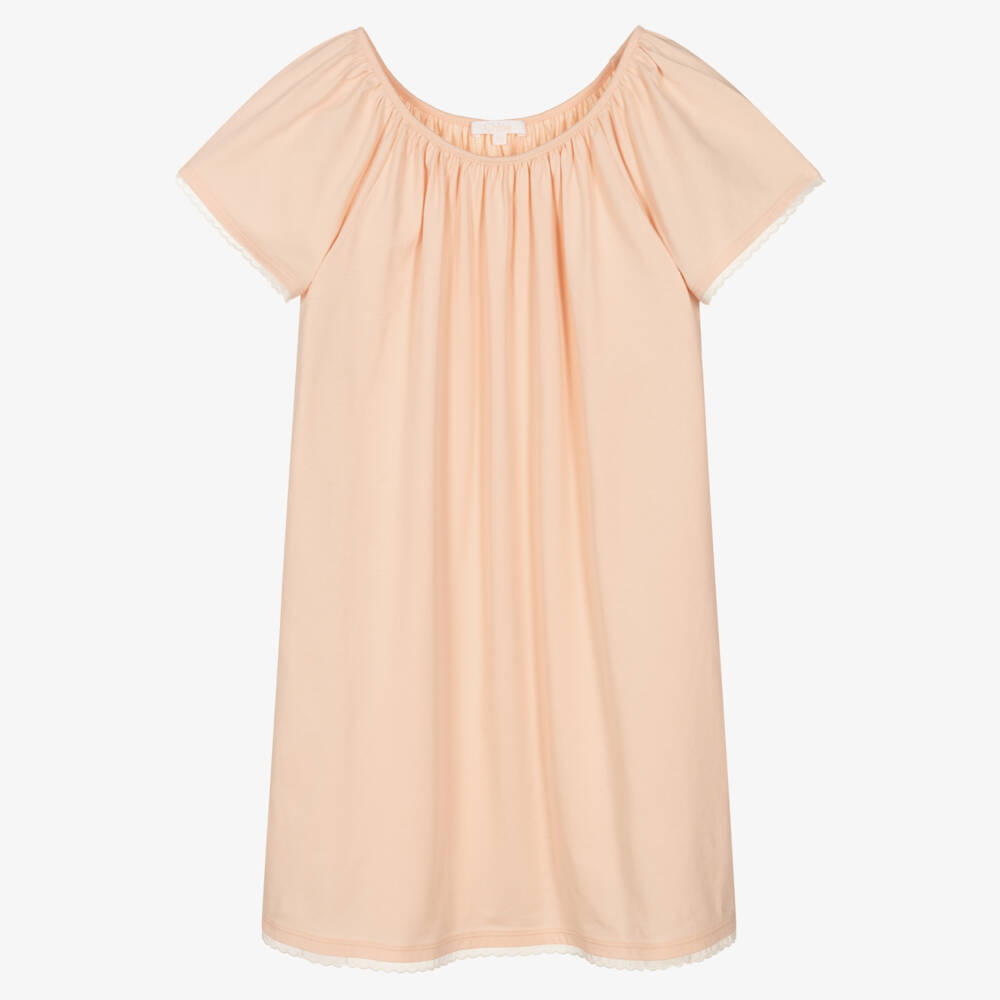 Gorgeous pale pink nightie for teen girls by French luxury brand Chloé, trimmed with stunning scalloped trims. This soft and stretchy style has delicate logo embroidery on the hem, flared sleeves and a wide neckline. It comes with a matching pink linen pouch, making it ideal to take to sleepovers.