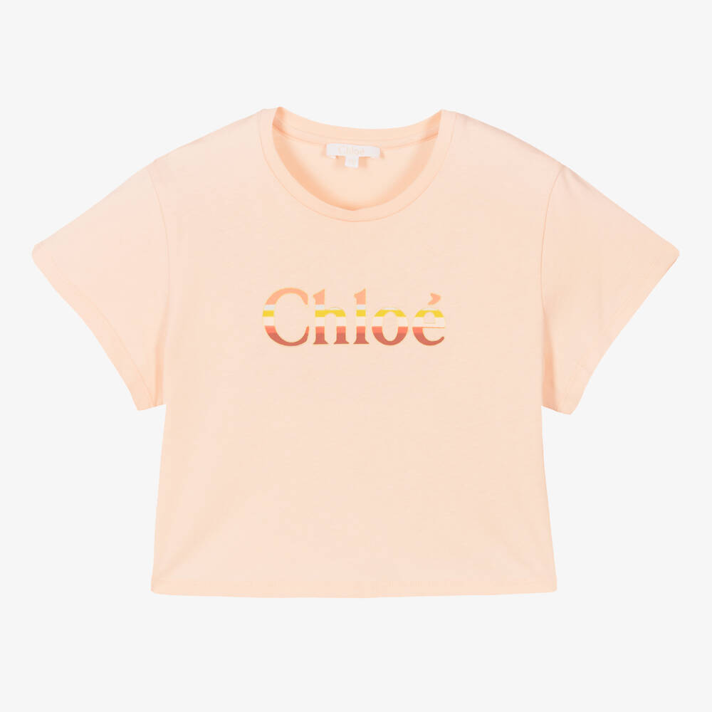 Teen girls pale pink T-shirt from luxury designer Chloé, made in soft organic cotton jersey. This boxy-fit top is super stylish, with the French label's signature logo print in a pink and brown gradient design on the front.