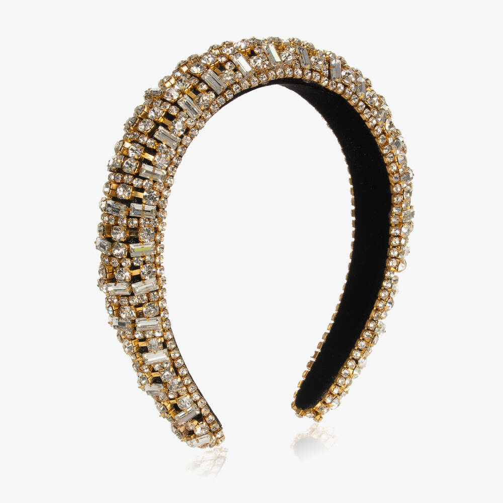 Padded black hairband for girls by David Charles, great for a glamorous look. The ideal accessory for any party look, this stunning hairband has captivating gold diamantés over a luxuriously soft velvet band.
