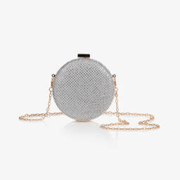 Sparkling silver round bag for girls by David Charles, encrusted with dazzling diamantés. This special occasion bag has a small, satin-lined compartment and a golden metal snap clasp fastening. A detachable, fine gold metal chain crossbody strap adds a versatile carry option to this glamorous clutch bag.