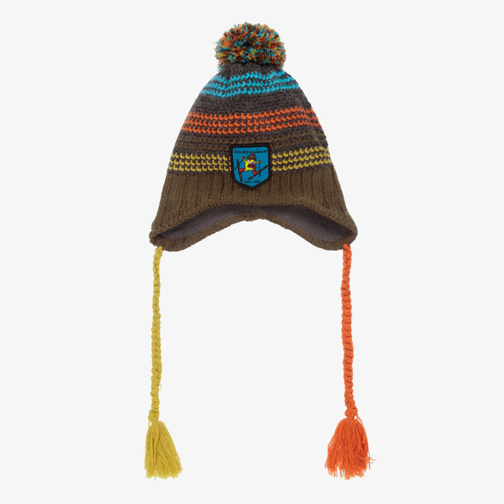 A cosy knitted hat for boys by Deux Par Deux, in a green and grey mix with orange and bright blue stripes. Made from a soft wool blend, it has a warm fleece lining and ear flaps with orange and green knitted ties. There is a large wool pom-pom on the top.