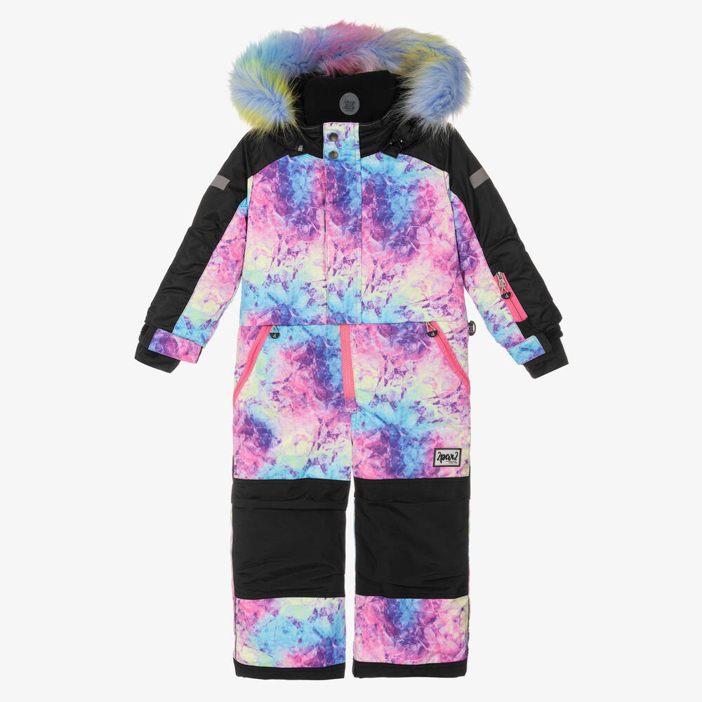 Girls black and pink snowsuit by Deux Par Deux, with warm yet breathable padding. Coated in waterproof TEFLON, this snowsuit has a detachable hood with removable faux fur trim, and a practical front zip fastening with a velcro storm placket. Bright and colourful, there are useful zipped pockets on the front, a pass pocket on one sleeve, and a handy internal pocket. Both the wrist and ankle cuffs have gaiters to keep the snow out and can be adjusted to different lengths for lasting wear. Partially lined in soft fleece, the waist is also adjustable for a comfortable fit, and the reinforced panels at the seat and knees protect against wear and tear. The elasticated carrying straps inside allow for easy transport and the fleece neck warmer provides extra warmth in cold weather.