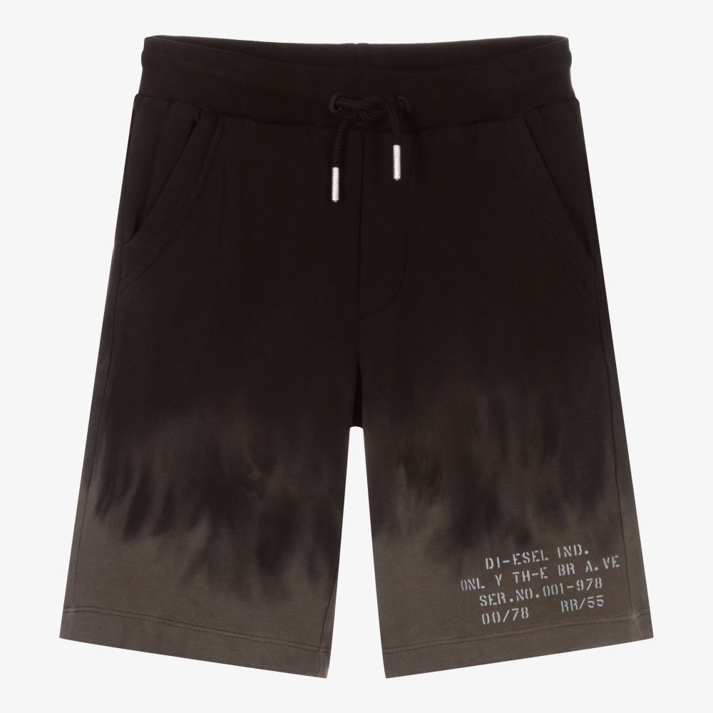 Teen boys black cotton sweatshirt jersey shorts by Diesel. Soft and mid-weight, they have a drawstring waist and three useful pockets. They have faded khaki green-bleached effect at the cuffs, with silver grey light-reflective printed details.