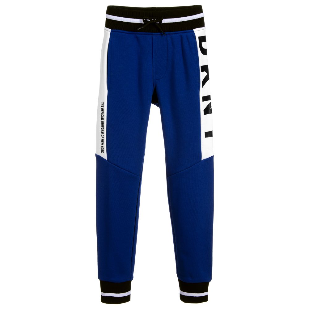 Blue logo joggers for boys by DKNY, made in comfortable cotton jersey. There are white panels on each leg with a logo printed on one and tagline embroidered on the other. They have an elasticated drawstring waist.