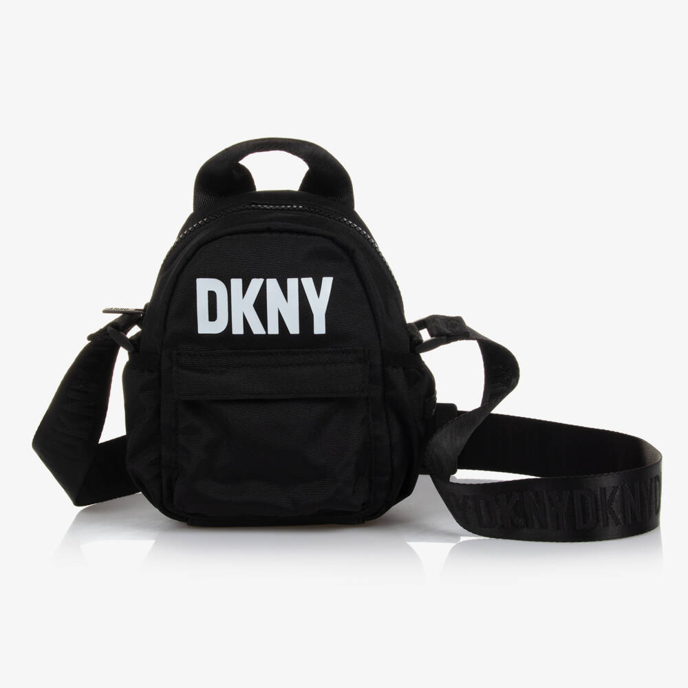Black, backpack-shaped bag for girls by DKNY, made from durable canvas with a lightly padded mesh back. It has a bold white logo print on the front and a small flap pocket below. A rubberised logo patch can also be seen on one of the side pockets. The zipped main compartment is fully lined and has an interior pocket to safely store small essentials. It has a single carry handle on the top and a branded strap that sits comfortably on the shoulder.