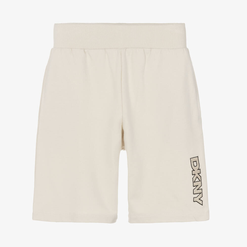 Casual and comfortable ivory shorts for boys and girls by American brand DKNY. They are made in soft, mid-weight cotton jersey with a ribbed, elasticated waistband and concealed side seam pockets. For instant designer appeal, they have embroidered logos on the front and back.