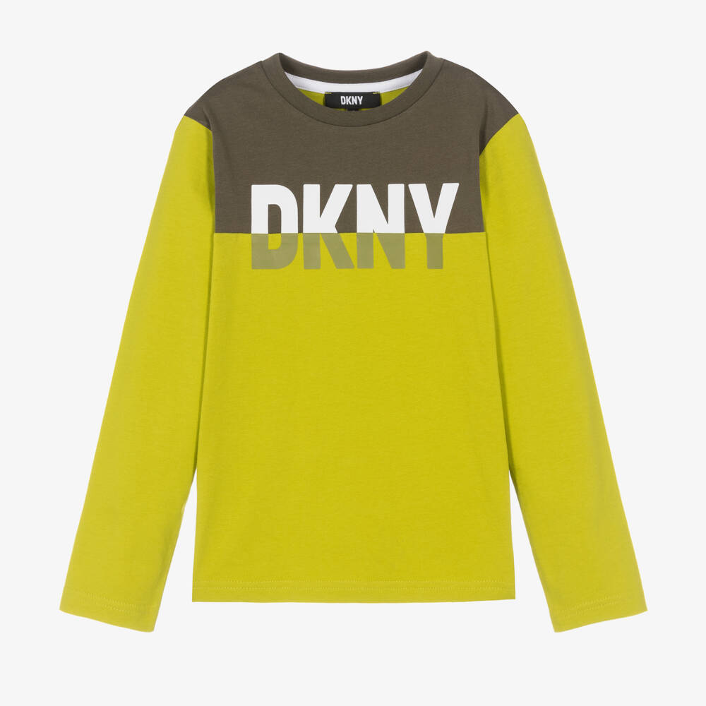 Green long-sleeved top for teen boys by New York designer, DKNY. This stylish wardrobe essential has a contrast khaki green yoke panel and a bold contrast logo print in white and green. An ideal transitional piece, it is made in comfortable cotton jersey.