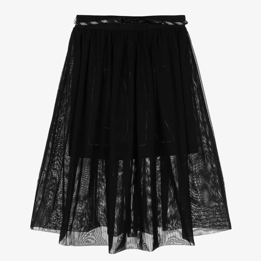 From DKNY, black skirt for teen girls with a white logo printed underskirt with a sheer mesh overlay. This stylish skirt comes with a black and white checkerboard detachable belt for an alternative finish to the feminine silhouette.