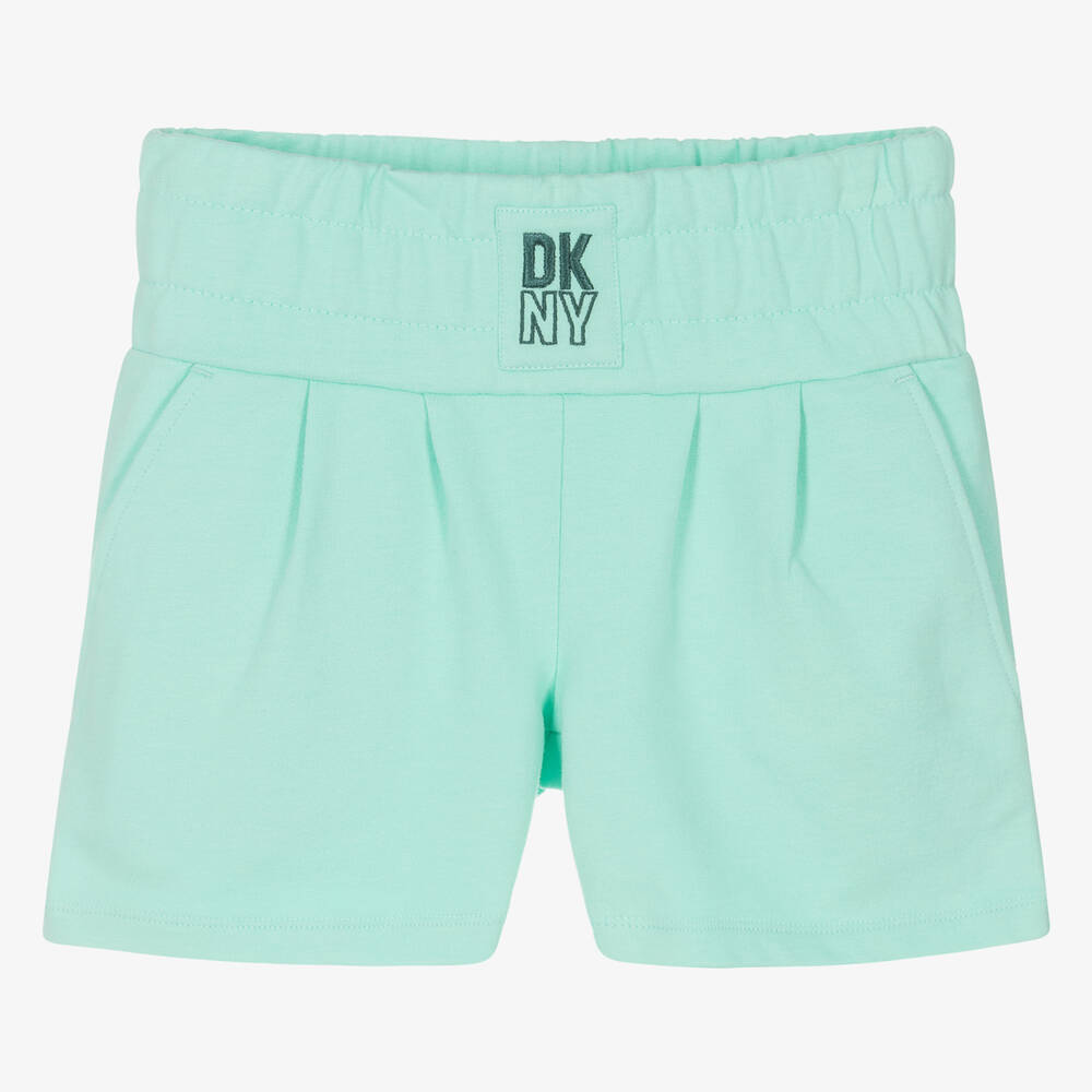 Casually styled, these sea green shorts for teen girls are by DKNY. For a signature finish, they have a dark green logo embroidered on the wide elasticated waistband and a branded design printed on the back. Made from soft cotton jersey, they have subtle pleated detailing on the front and useful slanted pockets.