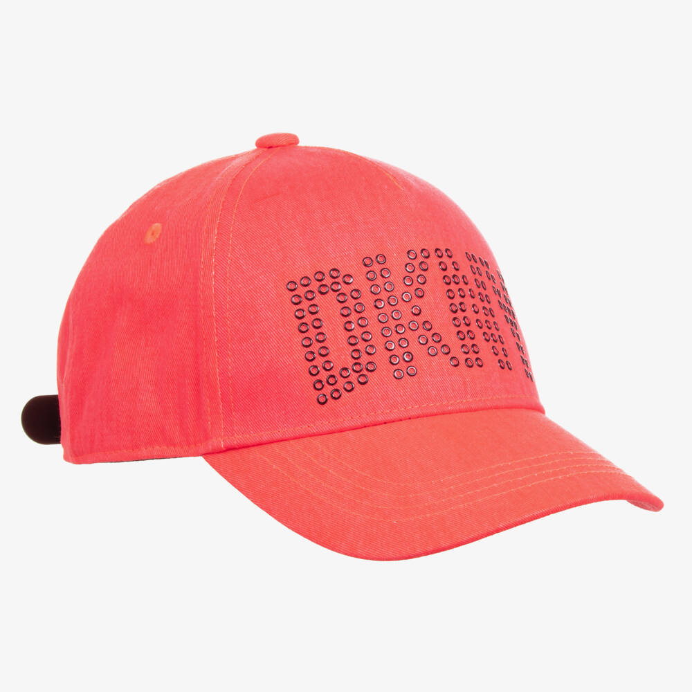 This neon orange-pink cap for teen girls by DKNY is a cool statement piece. Featured on the front is a black studded logo design for instant brand awareness. The adjustable velcro strap on the back is enhanced by a rubberised logo tab, adding extra designer appeal. It is made in silky twill and trimmed with an inner sweatband panel made from soft, breathable cotton, great for warm-weather wear.