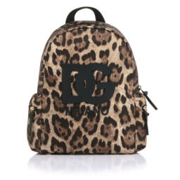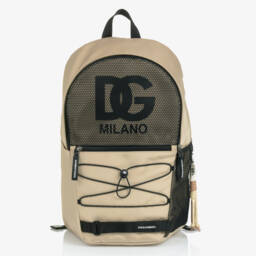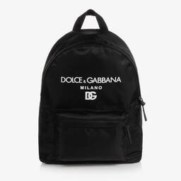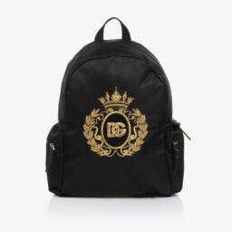 Black backpack for boys and girls by luxury brand Dolce & Gabbana. An eye-catching DG logo crest is embroidered in gold on the front, embellished with shiny gold sequins. Silky smooth, this stylish bag has a zip fastening main compartment and two zipped side pouches. There are adjustable padded shoulder straps, a webbed carry candle, and a useful name tag holder.