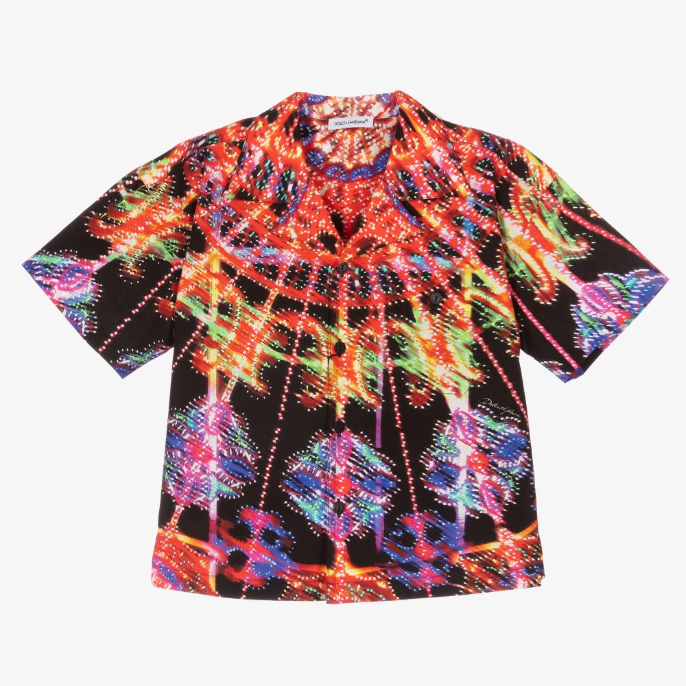 Colourful shirt for boys by luxury Italian designer Dolce & Gabbana, with the brand's Illumination print. Inspired by the adult collection, it is made in comfortable cotton poplin. It has a revere collar, black logo button fastenings and a button-down chest pocket with a printed logo below.
