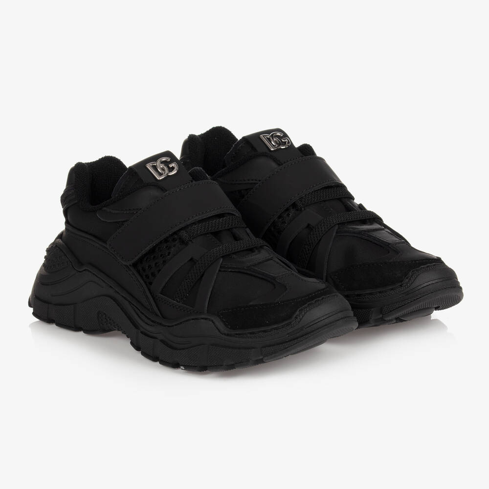 Sporty black trainers for boys and girls, by luxury Italian designer Dolce & Gabbana. Made in a combination of leather and hard-wearing nylon, they have a silver DG logo badge on the tongue, a padded heel, and a soft towelling lining to absorb moisture. Featuring a chunky black moulded outer sole, they have an easy velcro strap fastening and elasticated laces.