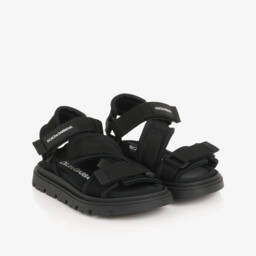 Black sandals for baby boys and girls by luxury Italian brand Dolce & Gabbana featuring a sleek design with adjustable velcro straps for easy wear. Made in soft neoprene and durable canvas, they have a lightly padded insole for comfort. There are tonal and white logos across the straps for instant designer appeal and ridged, non-slip rubber outer soles for good grip.