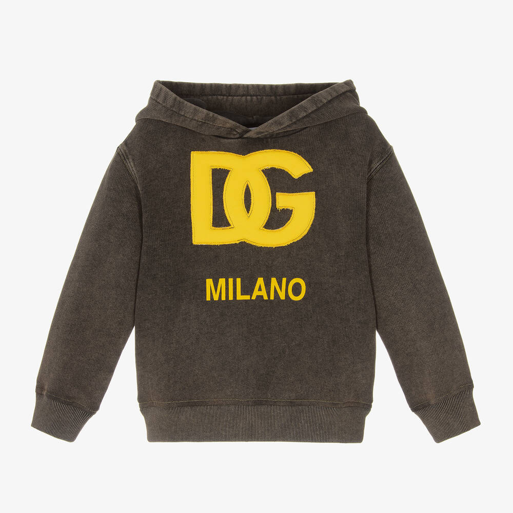 Oversized hoodie for boys by luxury designer Dolce & Gabbana, in faded, acid-wash black. Effortlessly cool and streetwear-inspired, it has a yellow crossover DG logo appliqué on the front for bold designer impact. Subtle yellow stitching ties the look together and the ribbed trims add instant comfort.