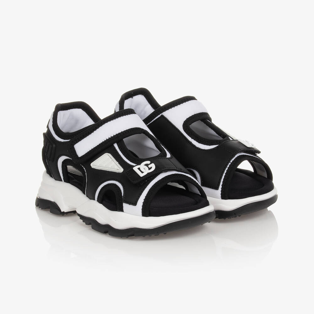 Sporty, black and white sandals for boys by luxury Italian brand Dolce & Gabbana. The lightly padded, soft neoprene straps have leather trims and rubber inserts for a cool, contemporary look. The toe strap is branded with a white DG logo for instant recognition and adjustable with velcro, with a further strap to secure at the ankle for an adjustable fit. The insole is cushioned for comfort and there is a chunky, trek style black and white rubber sole with deep tread for improved grip.