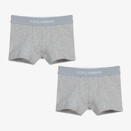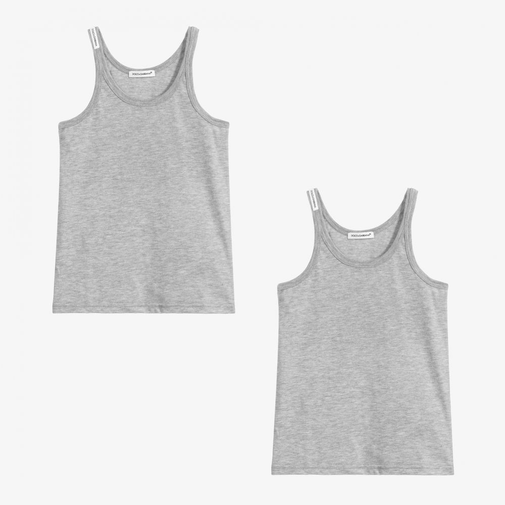 Pack of two grey vests for boys from luxury designer Dolce & Gabbana. They are made in soft cotton jersey, with a white and black logo branding on one shoulder. They come in a lovely branded box.