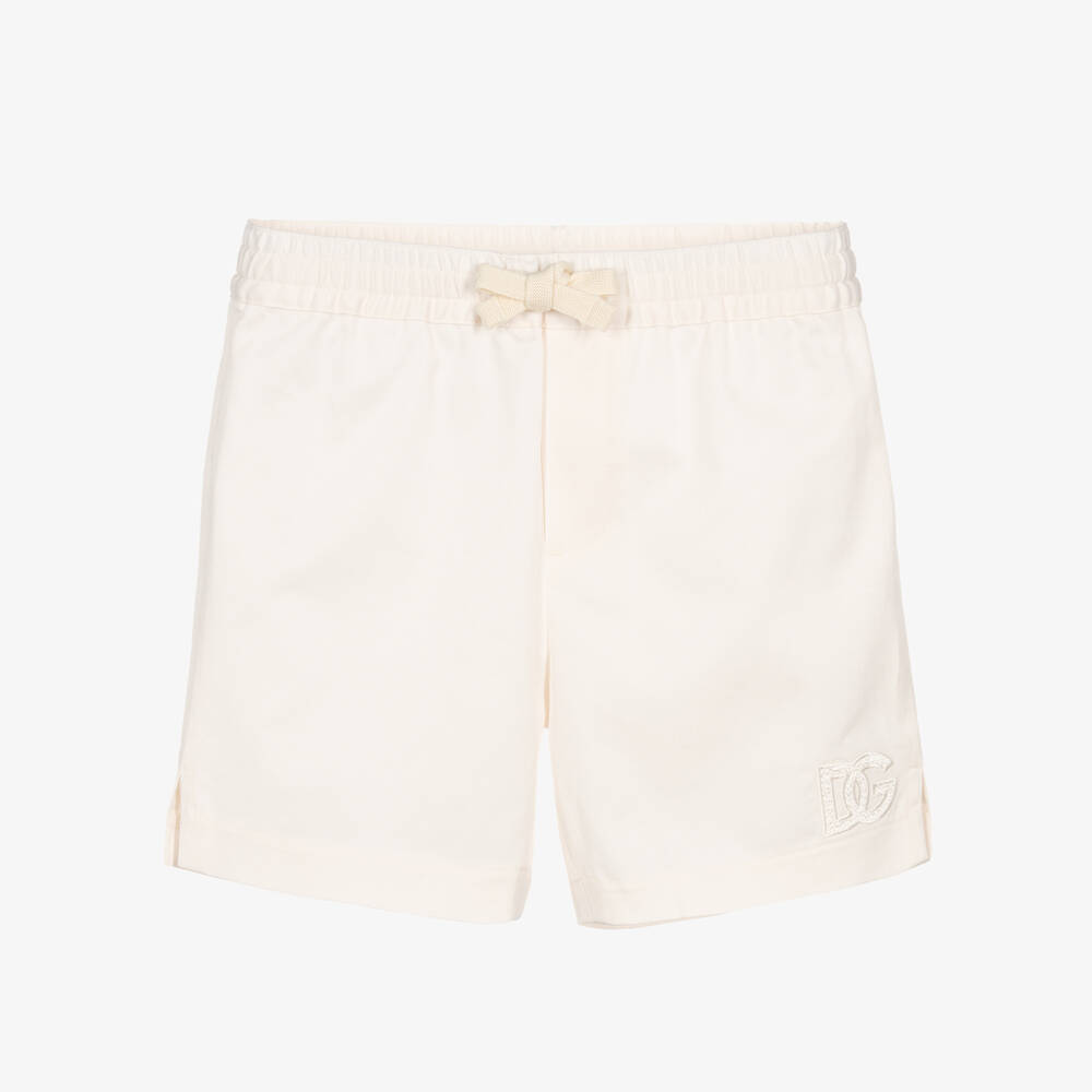 Ivory shorts for little boys by luxury Italian brand Dolce & Gabbana, made in soft and smooth cotton twill. These casual shorts have split hems, a drawstring waist and a tonal embroidered crossover DG logo on one leg for a subtle designer finish.