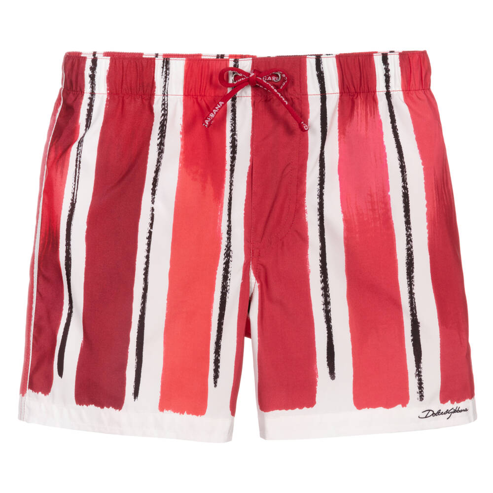 Red, white and black striped swim shorts for boys by luxury Italian brand Dolce & Gabbana. Made in soft, silky polyester, they have a lightweight mesh lining, a pocket on the back and an elasticated waistband with a branded red drawstring.